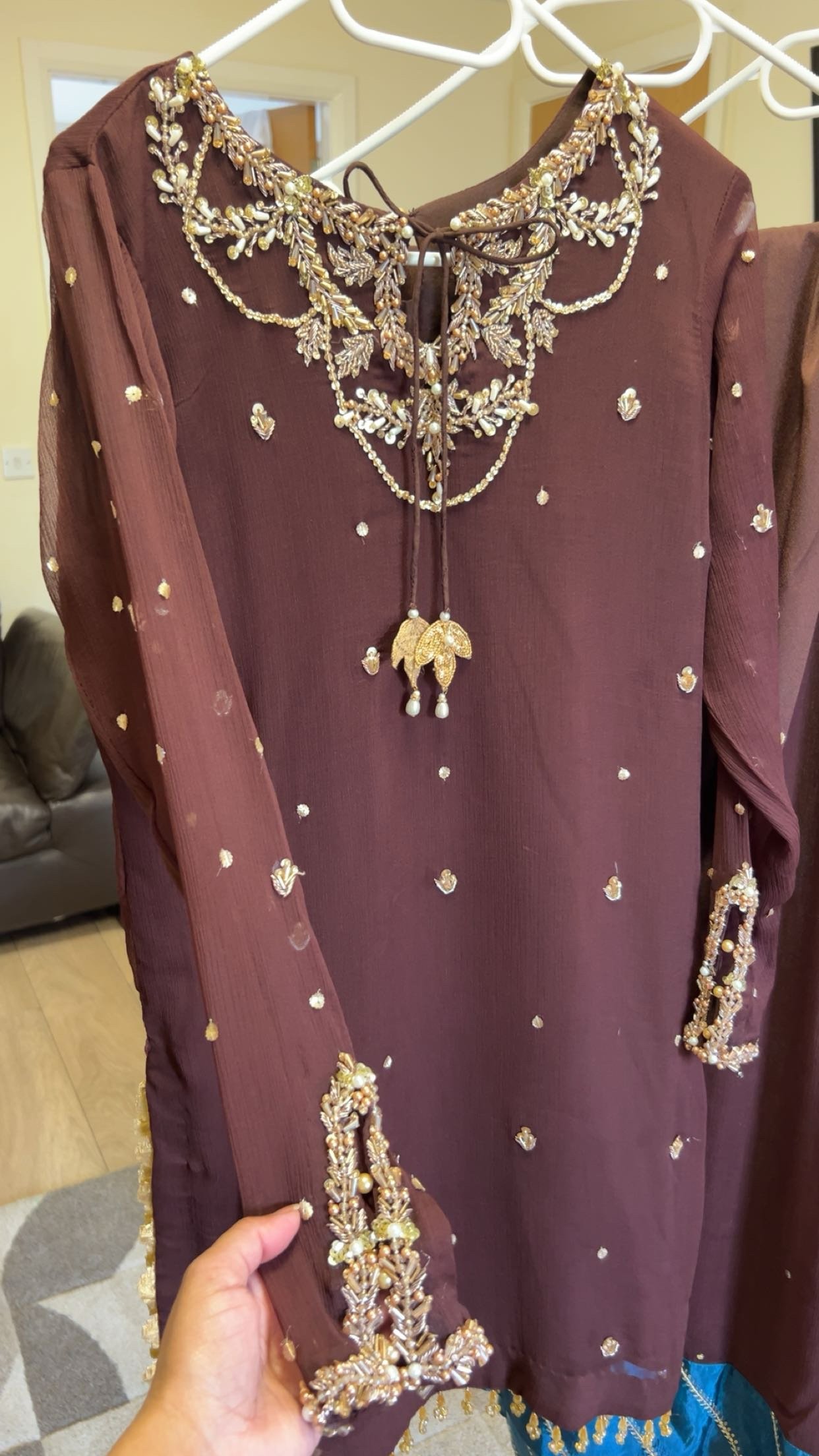 - Adda worked neckline, sleeves and spray hand worked on all over on shirt & sleeves