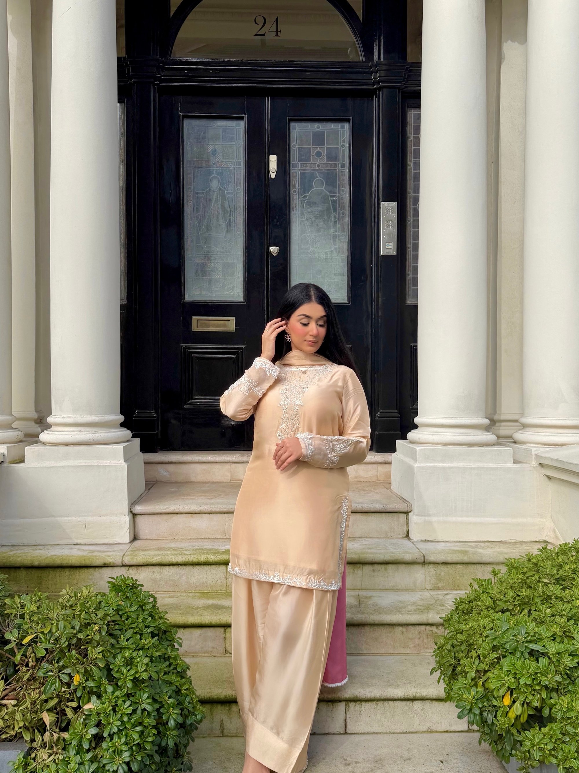 pure shisha silk farshi shalwar with thread and motifs embroidery beautifuly done embroidery in organza for sleeves with pearlz details